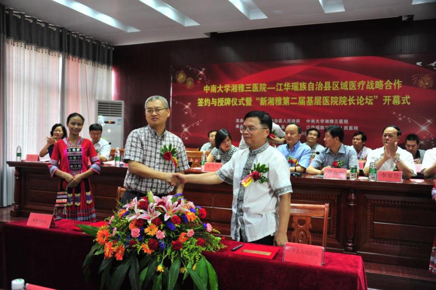 2013年6月19日,中南大学湘雅三医院为江华县人民医院授牌“中南大学湘雅三医院技术指导医院”,与江华县人民政府签署医疗帮扶战略协议,与江华县人民医院签署医疗帮扶合作协议,拉开健康扶贫的序幕。