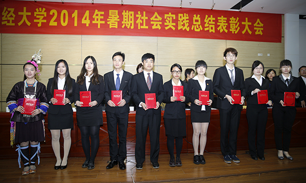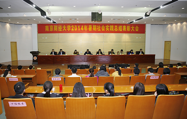 教务处处长陆华良宣读了《关于表彰南京财经大学2014年暑期“三下乡”社会实践活动先进集体和先进个人的决定》,国际经贸学院等5个学院获得“先进单位”荣誉称号;会计学院等5个学院获得“优秀宣传成果奖” ;经济学院“城镇化农民利益保护暑期实践小分队”等10支团队获得“十佳团队”荣誉称号;经济学院“互联网金融对商业银行的影响及对策研究——以第三方支付为例”等10篇调研报告获得“十佳报告”荣誉称号;经济学院“南京财经大学互联网金融调研团队”等10支团队获得“十佳风尚奖”;经济学院董远舟等10名同学获得“十佳使者”荣誉称号;财政与税务学院“南京市栖霞区国家税务局实践基地”等10个学院实践基地获得“优秀社会实践基地”称号。