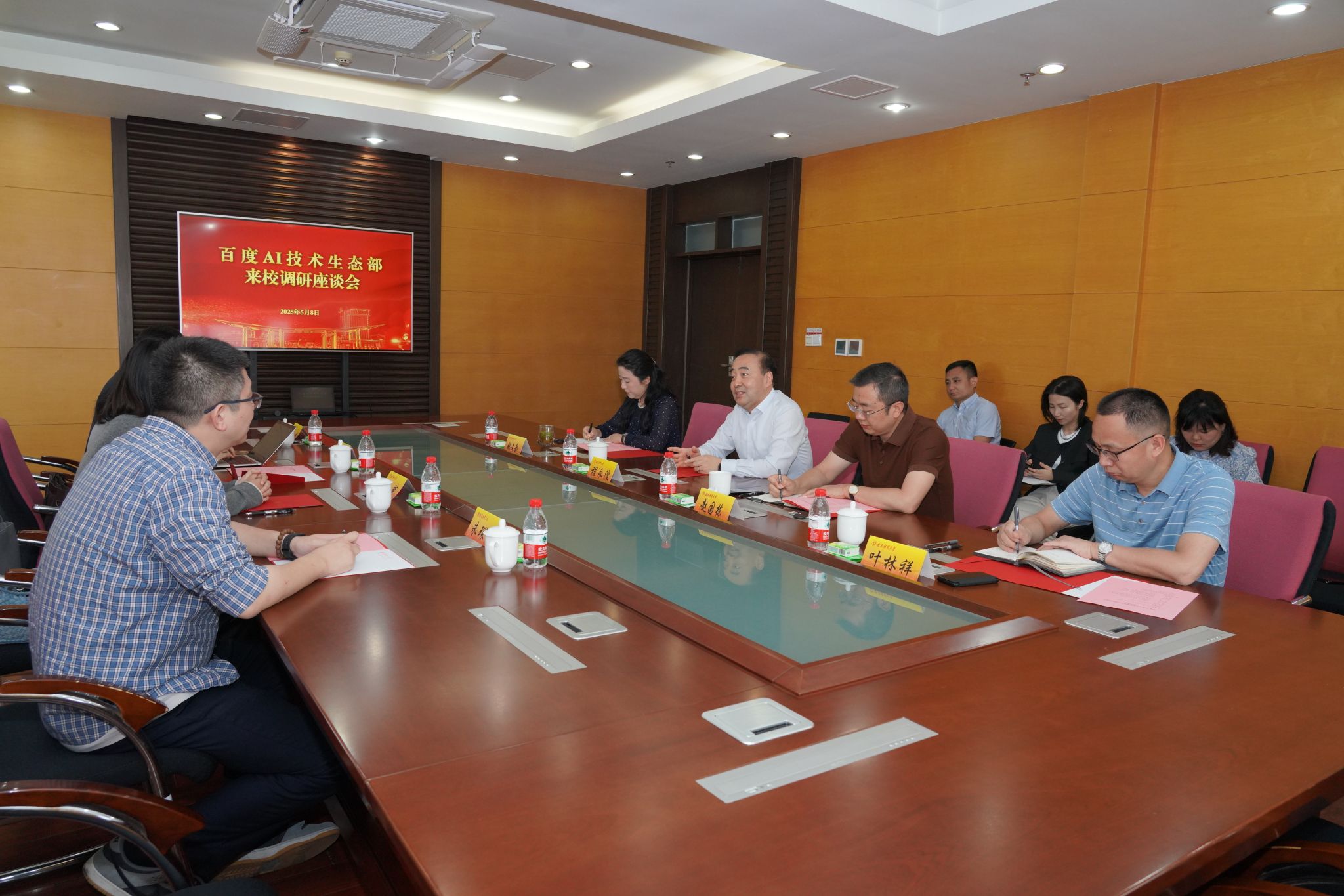 5月8日上午,百度AI技术生态运营总监谢梦一行来我校调研交流,座谈会在仙林校区行政楼1101会议室召开。校长程永波,党委常委、副校长赵国栋,党委常委、副校长姚文韵,党委常委、副校长叶林祥出席座谈会。百度AI技术生态教育生态运营负责人钱芳、百度飞桨(南京)人工智能产业赋能中心副主任朱琛齐、百度AI技术生态运营经理邵一鸣,我校党政办、党委宣传部、研究生院、会计学院相关负责人参加座谈会。