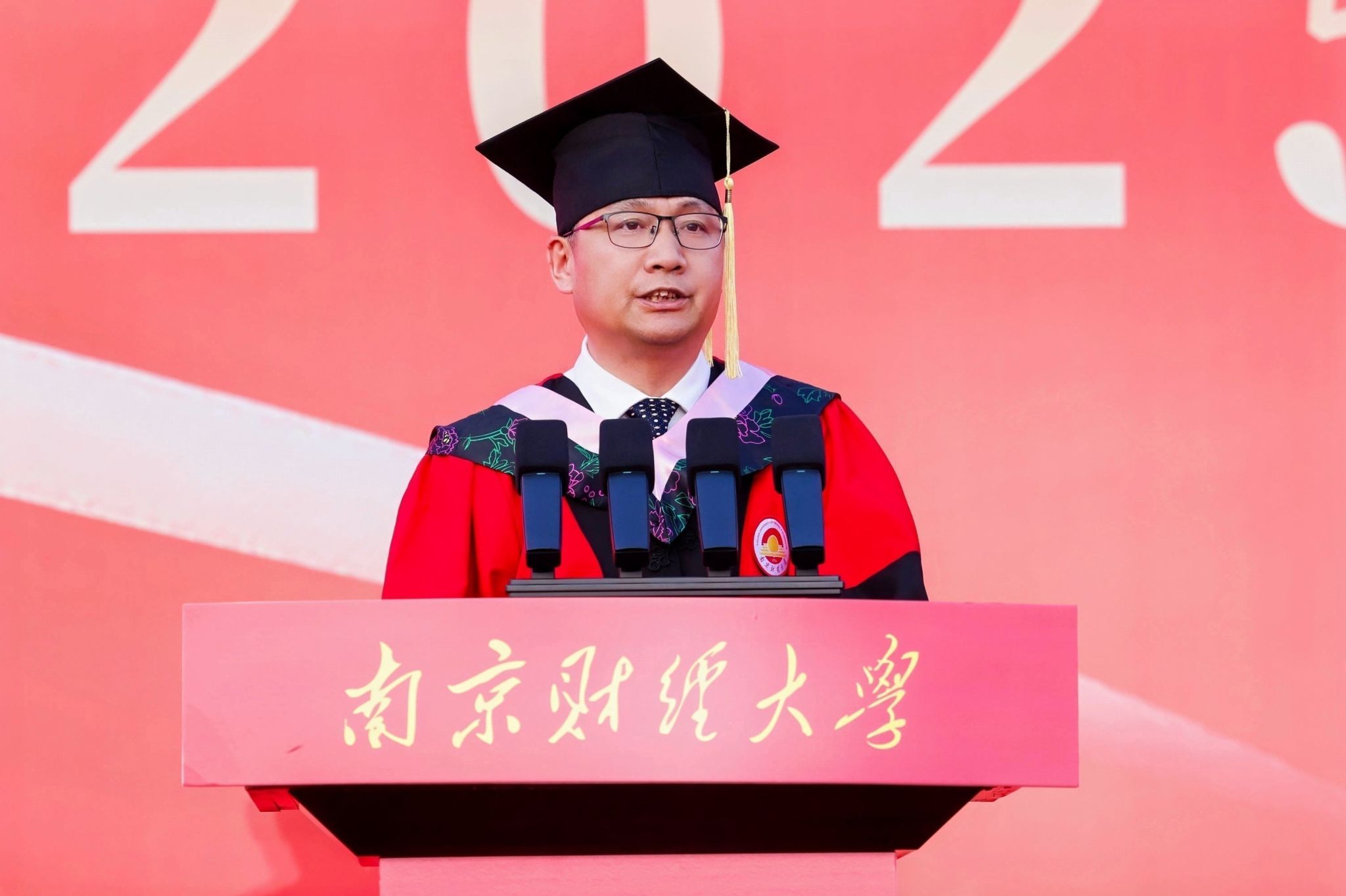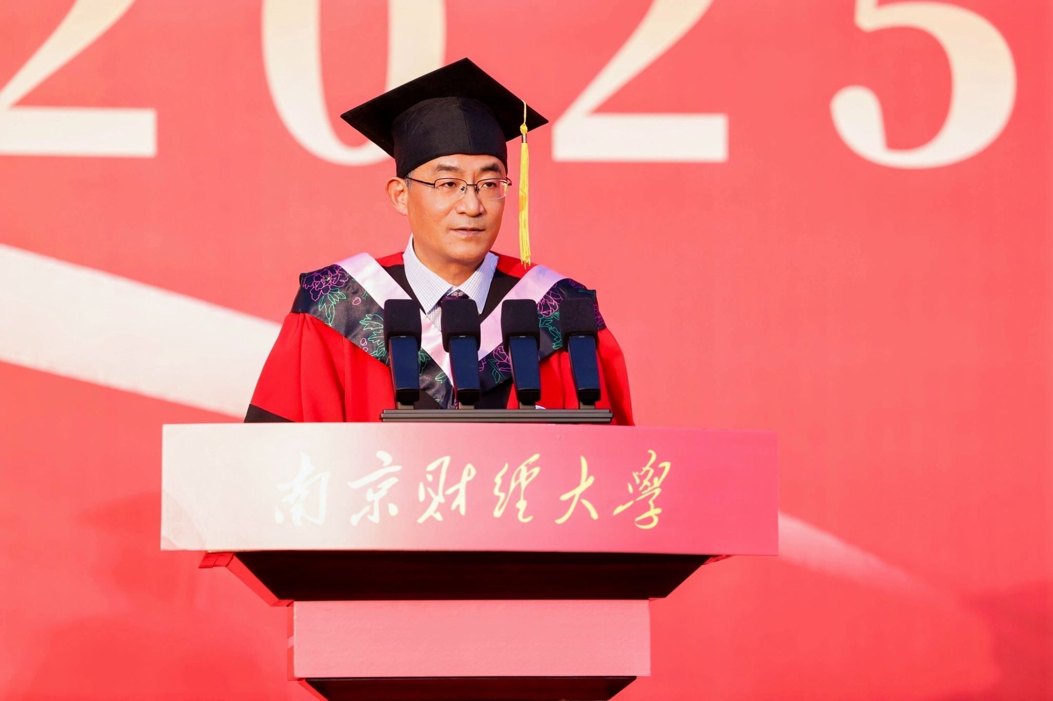 毕业典礼在雄壮的国歌声中拉开帷幕。程永波校长以《挺膺担当 务实进取》为题致辞。他代表学校向2025届全体毕业生致以最热烈的祝贺,向辛勤培育他们的师长、一路相伴的家人,致以最崇高的敬意和最诚挚的感谢。程永波校长以饱含温情的“镜像”语言,再现了2025届学子一个个闪光的“南财瞬间”,回顾了大家砥砺前行的成长历程,讲述了大家以理想为帆、以拼搏为桨、以信念为舵的奋斗篇章。所有可爱的毕业生们都以特有的方式诠释了青春最美的模样,书写了动人的南财故事。