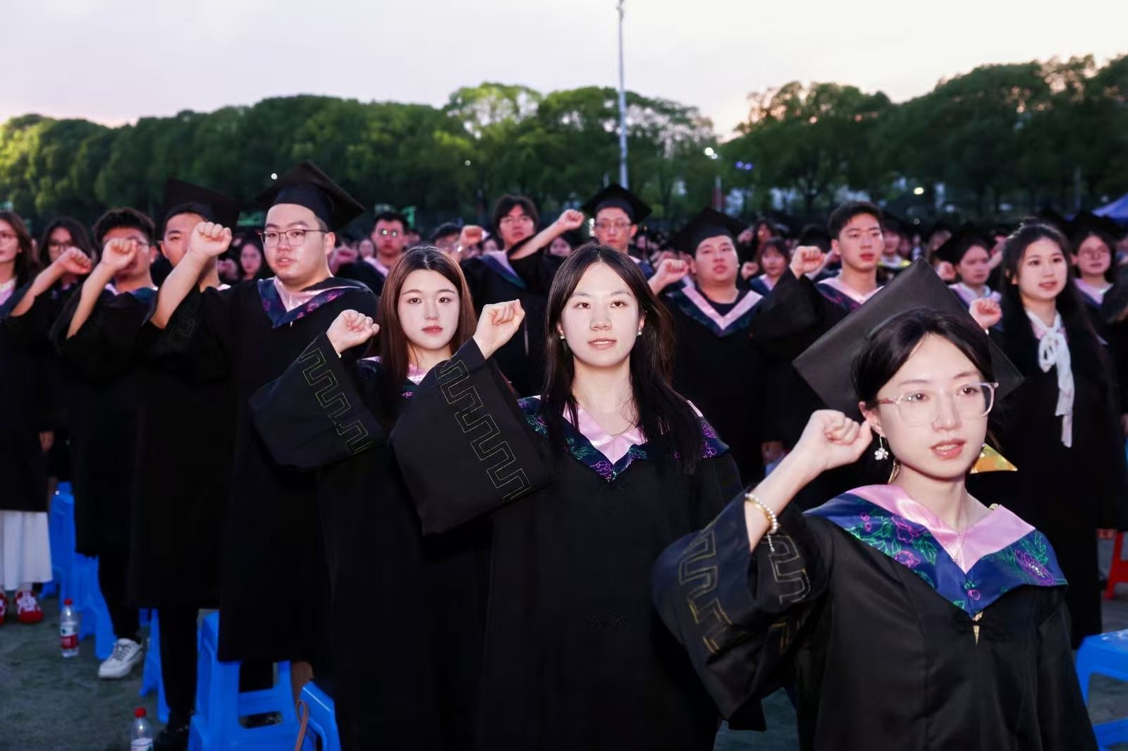 全体毕业生紧握右拳,庄严宣誓。在铿锵有力的毕业誓词和悠扬的《南财大之歌》中,2025届毕业生的青春故事翻开了新的一页。