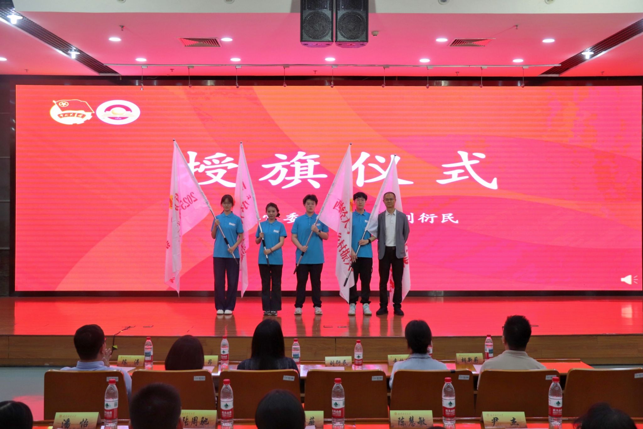 刘衍民副校长为2025年暑期社会实践团队代表、“两个计划”志愿者代表、“青年实干家计划”代表以及乡村振兴“小组团”志愿者代表授旗,并向同学们提出三点希望:一是心怀“国之大者”,在基层熔炉中铸魂扎根。把课堂所学转化为破解发展瓶颈的密钥,以实际行动践行“请党放心,强国有我”的庄严承诺。二是勇当“攻坚先锋”,在振兴征程中敢为善为。充分发扬钉钉子精神,聚焦乡村振兴关键领域,开拓创新、务求实效。三是锻造“文化匠心”,在乡土中国里传承创新。通过挖掘地方特色、创新呈现方式,用知识消弭城乡数字鸿沟、用创意培育文旅融合新业态,真正实现以文化人、以文培元。最后,他要求有关部门和各学院牢固树立“安全第一、生命至上”的理念,合理安排行程、完善应急机制,确保社会实践活动安全有序开展。
