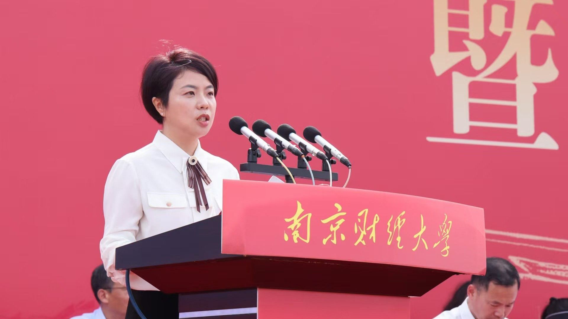 嘉宾代表、江苏省南通市海门实验学校校长黄芳发言。她勉励新生将小我融入大我,以青春奉献家国;心有所信、韧以成事、融通致用,在南财汲取知识、锤炼品格、拓宽视野、结交挚友,最终成长为更好的自己。