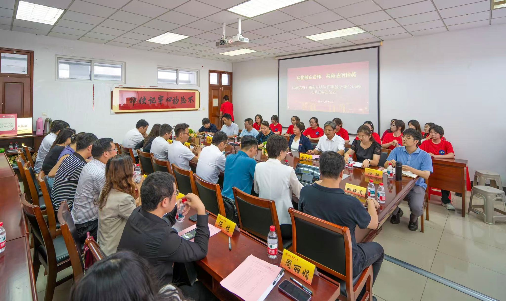 9月12日下午,法学院与上海市光明律师事务所联合培养的“涉外法治光明班”启动仪式在仙林校区德正楼404会议室举行。党委常委、副校长李煜,光明律师事务所全球管委会主任王树平,光明律师事务所(南京)主任张毅,光明律师事务所(南京)党支部书记刘帅出席仪式,学生处处长韩力争、对外联络处处长陆明峰、法学院领导班子成员、光明律师事务所二十余名高级合伙人、法学院教师代表、“涉外法治光明班”全体新生参加仪式。仪式由法学院党委书记黄建国主持。