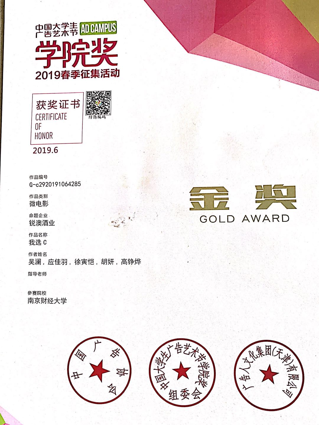 6月26日晚,中国大学生广告艺术节学院奖2019春季赛颁奖盛典在北京落下帷幕。我校推荐的作品《微醺,是我与世界的和解》(参赛成员:吴澜、胡妍、应佳羽、高铮烨<新闻学院>,徐寅恺<艺术设计学院>)获得了锐澳酒业命题微电影类金奖,并与其他5组金奖比拼后最终脱颖而出,赢得了唯一的全场大奖,也是此项赛事的最高殊荣,并获得5万元奖励。