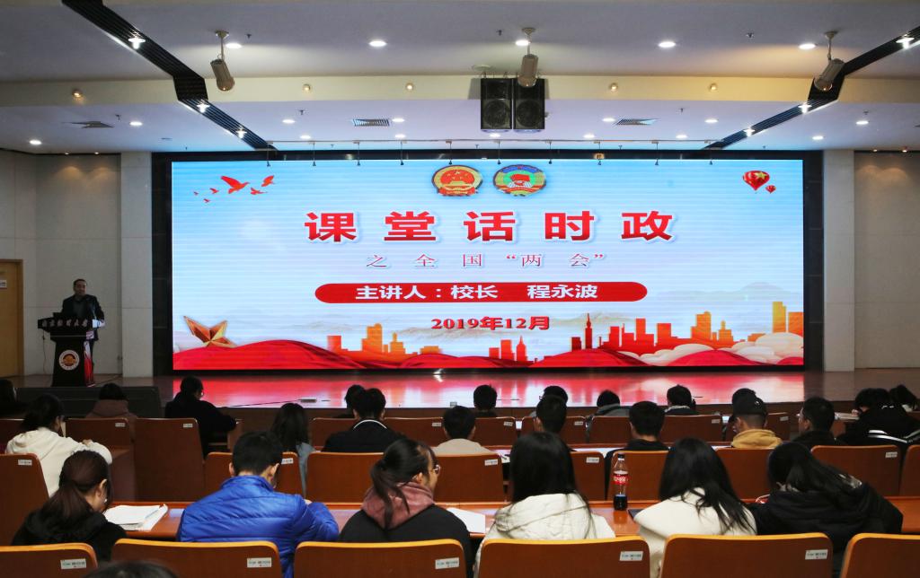 12月11日晚,校长程永波在仙林校区图书馆报告厅讲授主题为“课堂话时政之全国‘两会’”的公开课。各学院2019级300余名本科新生听课。