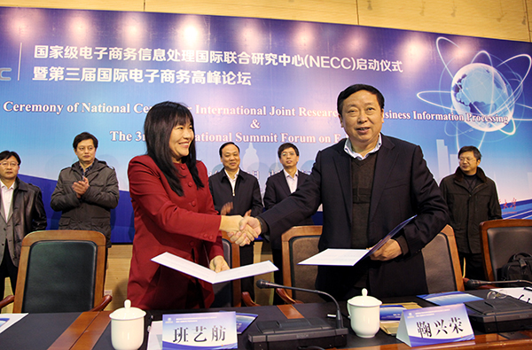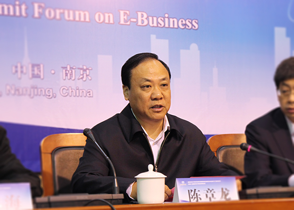 陈章龙书记致辞。他代表学校对科技部、商务部、江苏省科技厅、商务厅及南京市科委对我校NECC的大力支持表示谢意,并指出,NECC的成立将为我校展开更全面深入的合作研究提供了良好的平台,促进电子商务学科的更好发展,加深我校国际化合作交流程度。