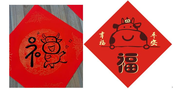 “福”承载的是中华民族对于美好生活的朴素向往,看到“福”到了,我们就知道“年”近了。活动期间,国际经贸学院的同学们挥毫泼墨,充分运用自己的丰富的想象力书写牛年新福字,给大家送去牛年新福气。这些福字都形态各异而又充满趣味,同学们将牛元素与“福”字巧妙结合。有的以元宝点缀偏旁、卡通牛形象为主体,寓意牛年发财暴富,有的则取谐音,祝大家“Happy new(牛)year!”。同学们与自己的“福”字进行合拍,一个个别出心裁的福字在中国红的衬托下,极具创意的同时也传递着浓浓的年味。