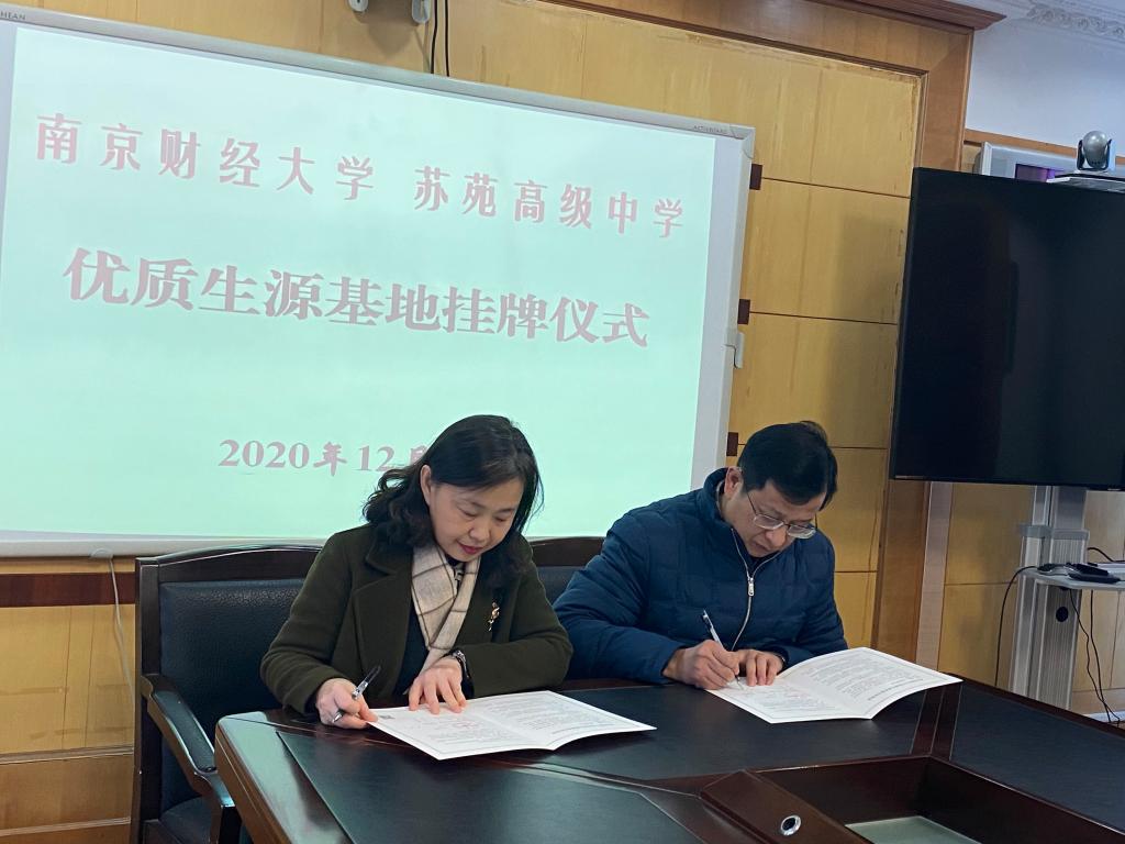 张阳军书记、孙菲副处长代表学校与两所中学签订了优质生源基地合作协议书,并授予“南京财经大学优质生源基地”铜牌。仪式后,双方围绕新高考背景下的招生动向进行了座谈。