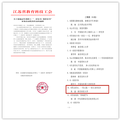 近日,省教科工会下发《关于就地过年教职工“一封家书 别样春节”征集活动优秀作品的通报》,我校财务处焦磊老师的《思念若水,一苇以航——给父亲的信》获二等奖。
