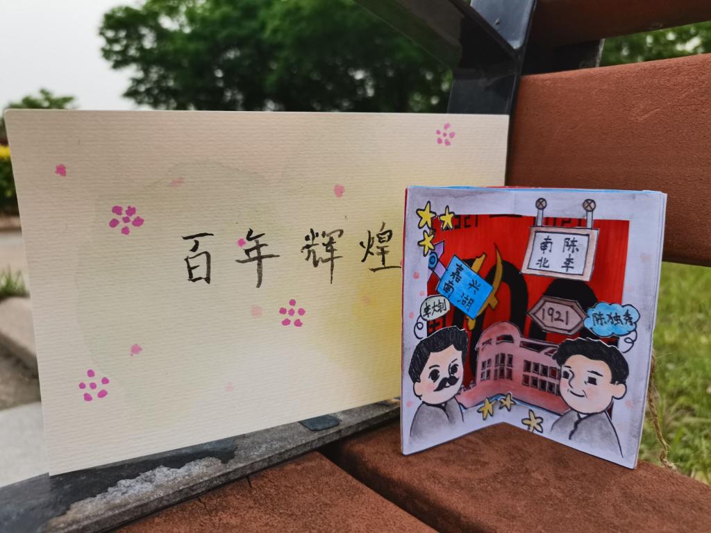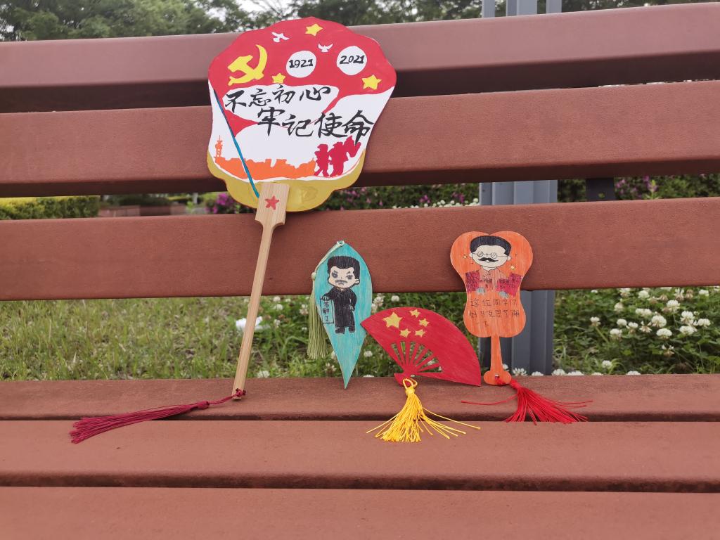 税收1902班顾雪寒制作了《建党伟业》立体卡,还原了1921年嘉兴南湖游船上中国共产党的建立。税收1902班戎露雪设计了建党百年的系列扇面和书签,将建党路上的英雄人物和相关小故事形象生动地展现出来。税收1902班汪思文巧妙运用拼豆,生动地将历史人物与建党百年制作成了卡通挂饰。卡通人物是李大钊先生像,代表着同李大钊先生一样为国思、为民忧,不停寻求国家出路的早期共产党人形象;挂饰以“100”为外框架,点明建党百年,数字“1921”“2021”明确对应建党与当今的时间点。