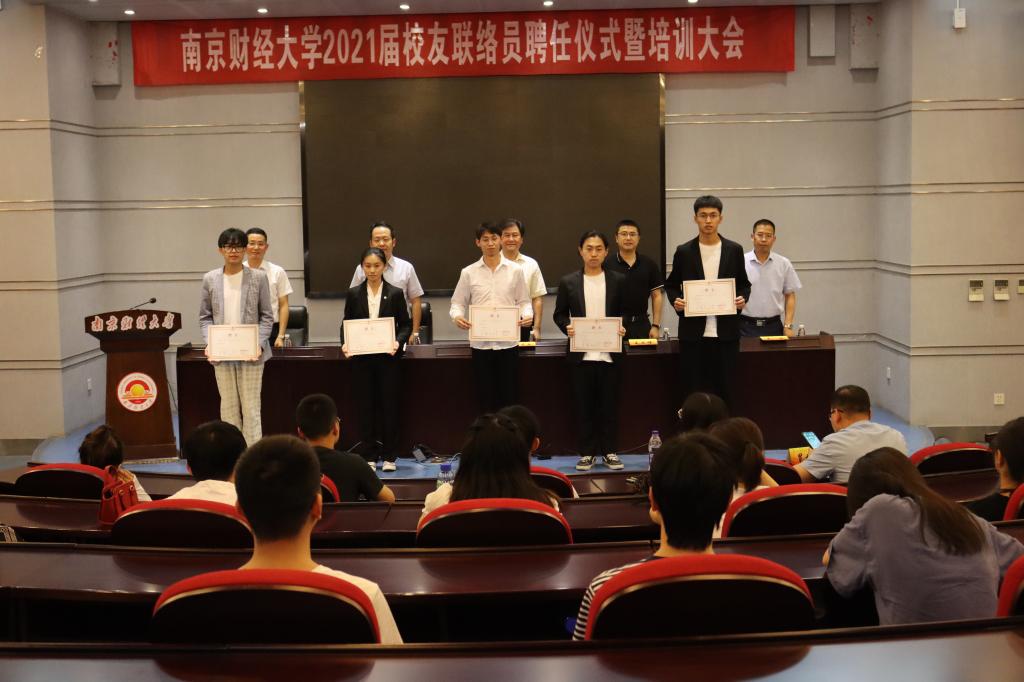 王冲副处长宣读了《南京财经大学校友会关于聘任2021届校友联络员的决定》,与会领导和嘉宾一起为2021届校友联络员代表颁发了聘书。
