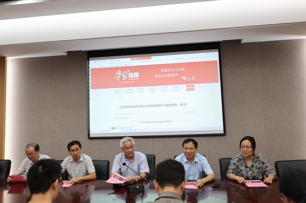 在教师节来临之际,习近平总书记给全国高校黄大年式教师团队代表回信。习近平总书记指出,好老师要做到学为人师、行为世范。要继续学习弘扬黄大年同志等优秀教师的高尚精神,同全国高校广大教师一道,立德修身,潜心治学,开拓创新,真正把为学、为事、为人统一起来,当好学生成长的引路人,为培养德智体美劳全面发展的社会主义建设者和接班人、全面建设社会主义现代化国家不断作出新贡献。9月9日,我校首批全国黄大年式教师团队(开放经济与产业发展)在国际经贸学院深入学习贯彻习近平总书记给全国高校黄大年式教师团队代表回信精神。