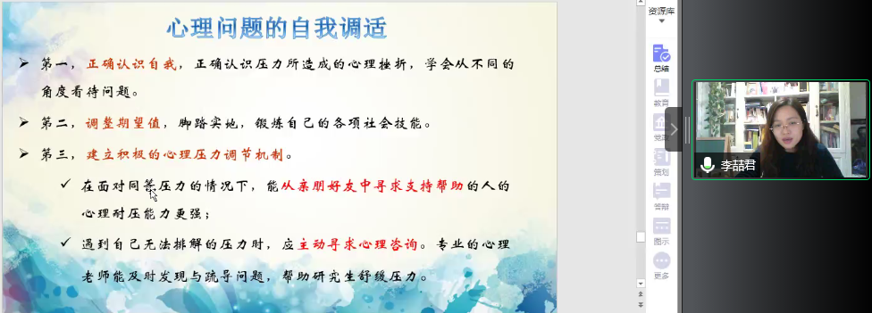 李喆君老师以实际工作中的案例为引,形象介绍了研究生常见的心理症状,并针对不同程度的精神障碍讲述了自我调试的三种方法:第一要正确认识自身,理性看待生活中的挫折带来的心理压力,学会从不同角度看待问题;第二要合理制定目标,在不断积累学习中提升自己的各项能力;第三要建立积极的心理压力调节机制,面对负面情绪与外界压力,采取不逃避、不激进的方式,学会和亲近的人适当表达,在良性的沟通中获得有效的疏导。遇到无法排解的压力时,应主动寻求专业心理咨询老师的帮助,通过更有针对性的治疗解决问题。