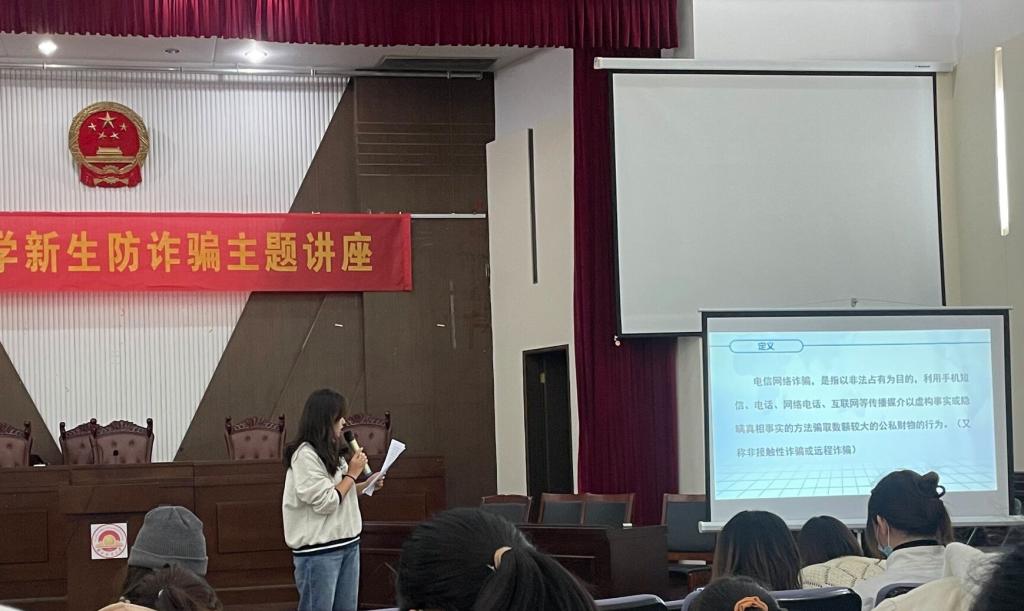 11月13日晚,校法律援助中心和法学院在仙林校区德正楼二楼模拟法庭联合开展新生防诈骗主题讲座。全体新生参加讲座。
