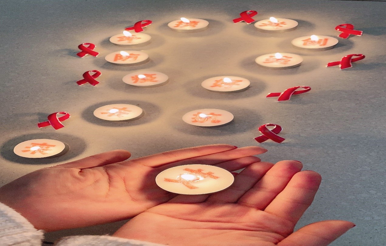 用蜡烛点亮“红丝带”来动员和倡导艾滋病防治