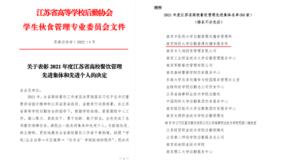 后勤基建处膳食服务科获评“2021年度江苏省高校餐饮管理先进集体”