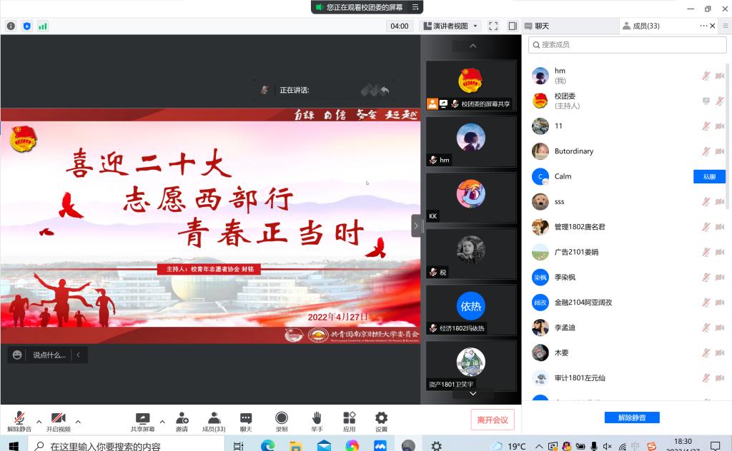 2022年“大学生志愿服务西部计划”招募工作已全面启动,为增进我校学生对西部计划的了解,鼓励青年学生投身西部、扎根基层、锻炼本领,4月27日,校团委开展了“大学生志愿服务西部计划”线上动员分享会。本次会议的主题为“志愿西部行、青春正当时”。校团委副书记张蔚伟、校团委相关工作人员、校青年志愿者协会负责同学、优秀毕业生代表及部分应届毕业生、在读研究生应邀参会。