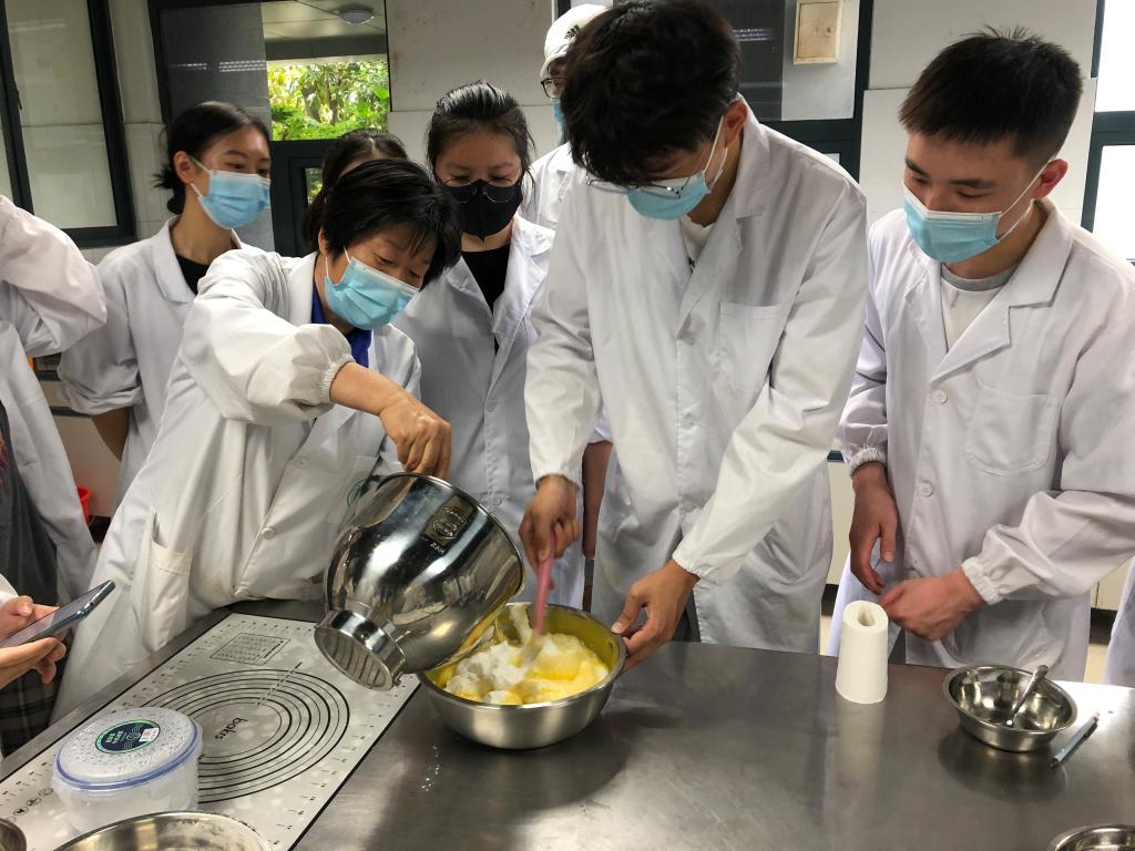 活动一经发布,名额便遭到“秒抢”,最终15位学生根据实验室要求完成安全考试并取得安全证书,获得了体验机会。活动开始,刘志云老师向大家简要介绍了蛋糕制作的流程,提醒学生穿好白大褂,注意操作安全。刘志云老师将学生分为两组并亲自示范,一组制作、一组观摩,分蛋黄、打蛋清、过筛面粉、搅拌均匀、装杯等。刘志云老师一边示范一边向学生讲述蛋糕制作的基本原理和技巧,“糖的加入不仅是增加甜味更是增加蛋糕的松软度。”“装盒后的蛋糕要在桌面敲一敲,烤的时候表面才能平整。”……刘志云老师告诉大家小小的纸杯蛋糕制作起来也并不容易,既需要掌握一定技巧,更需要耐心、细心、专心,才能做出好吃、好看、健康的蛋糕。同学们仔细听、认真做,一丝不苟,虽然操作并不熟练,但学得有模有样。吃到自己用心做出的纸杯蛋糕,每一位同学脸上都洋溢着快乐幸福的笑容。