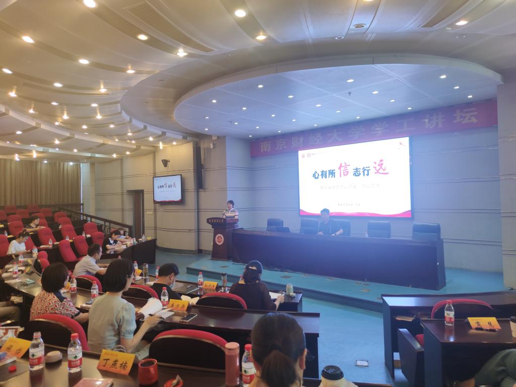 为深入学习贯彻习近平新时代中国特色社会主义思想,落实全国全省教育大会精神,不断提升辅导员队伍的理论水平、职业能力和专业素养,7月8日,我校在仙林校区行政楼二楼报告厅召开首期“学工讲坛”暨辅导员暑期专题培训会。南京航空航天大学马克思主义学院党委书记徐川、南京师范大学新闻与传播学院党委书记沈菲应邀作专题讲座。会议由党委学生工作部部长韩力争主持。学工部、研工部领导班子成员及相关工作人员,各学院学工秘书,全体本科生、研究生辅导员参加培训会。