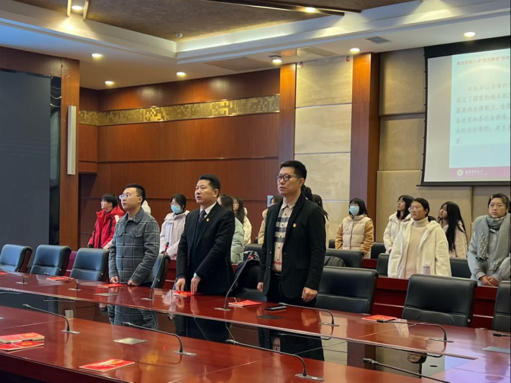 12月2日上午,我校在仙林校区工科楼二楼会议室设立大学生“宪法晨读”活动分会场,组织部分学生代表参与宪法学习,活动由法制办公室副主任韩启飞主持。会议开始前,全体师生为江泽民同志默哀。法制办公室副主任吴庚祐领读宪法部分条款,现场学生及全体人员跟读。同学们精神饱满,情绪激昂,大声跟随诵读,用心体会宪法的庄严,进一步了解到宪法是国家的根本大法,是治国安邦的总章程,是党和人民意志的集中体现,深刻领会中国特色社会主义法治精神,树立中国特色社会主义法治信仰。学习过程中,同学们聆听了歌曲《宪法伴我们成长》。