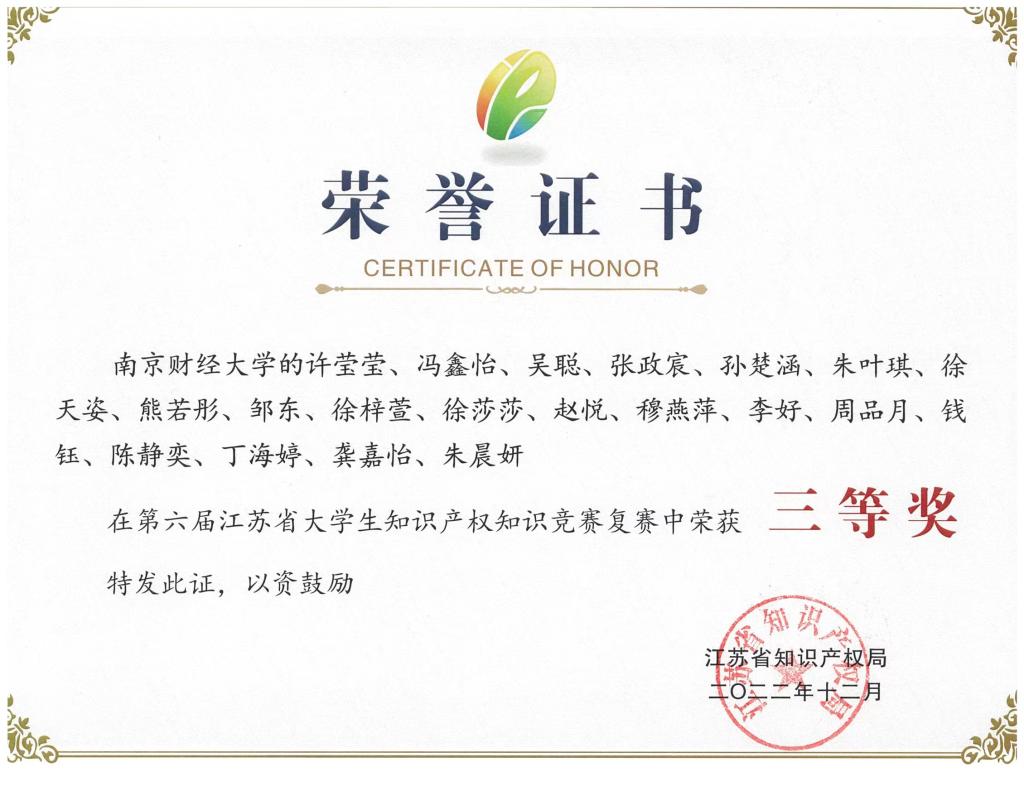 我校学子获第六届江苏省大学生知识产权知识竞赛复赛三等奖