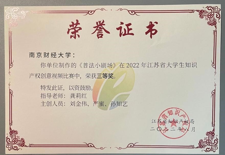 我校学子获第六届江苏省大学生知识产权创意视频比赛三等奖