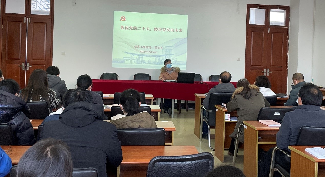 12月14日下午,信息工程学院党委书记周亚芳在仙林校区德业楼406会议室,以“数说二十大,踔厉奋发向未来”为题,为全院教职工宣讲党的二十大精神。她介绍了党的二十大整体情况,并对报告中的“中心任务、第一要务,两步走、两个行,三个务必、三件大事,五项原则、五个必由之路,六个坚持”等要点等作了详细分析,提出要按照“五个牢牢把握”“七个聚焦”的要求全面深入贯彻落实党的二十大精神。最后,周亚芳书记就全体教职工深入学习贯彻党的二十大精神提出三点要求:一是提高政治站位。要深刻领会习近平总书记关于学习贯彻党的二十大精神提出的“五个牢牢把握”的重要指示精神,和《中共中央关于认真学习宣传贯彻党的二十大精神的决定》明确的“七个聚焦”要求,深刻领悟“两个确立”的决定性意义,增强“四个意识”、坚定“四个自信”、做到“两个维护”。二是补足精神之钙。要运用好辅导材料,采取多种形式加强学习,深刻领悟新时代10年伟大变革的深远历史意义、习近平新时代中国特色社会主义思想的立场观点方法和中国式现代化的中国特色和本质要求,更加坚定中国特色社会主义道路自信、理论自信、制度自信、文化自信,自觉用党的创新理论武装头脑、指导实践、推动工作,切实做到知行合一、笃信笃行。三是落实学习成效。要深刻领会以人民为中心的发展思想、“三个务必”的谆谆教导和团结奋斗的时代要求,深刻领会党的中心任务和未来五年的重大部署,深刻把握高质量发展这一首要任务,大力弘扬建党精神,坚持为党育人、为国育才,聚焦高质量党建和高质量发展,坚持问题导向,结合自身实际狠抓工作落实,切实把学习成果转化为推动发展的强大动能。