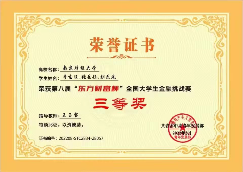 2月27日,由团中央青年发展部主办,全国学校共青团研究中心、东方财富信息股份有限公司和中央财经大学承办的第八届“东方财富杯”全国大学生金融挑战赛圆满结束。我校金融学院学子获江苏省二等奖、全国三等奖。