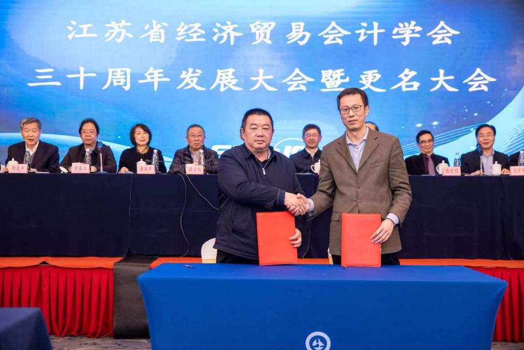 3月18日下午,江苏省经济贸易会计学会成立三十周年发展大会在南京召开,会上,会计学院与江苏省经济贸易会计学会、江苏海企长城股份有限公司签订合作协议。省商务厅副厅长倪海清、省国资委二级巡视员唐燕萍、省财政厅会计处处长兼省会计学会秘书长黄春育、省民政厅二级调研员张成标出席大会并讲话。我校会计学院院长沈永建教授受邀在大会作主题发言。