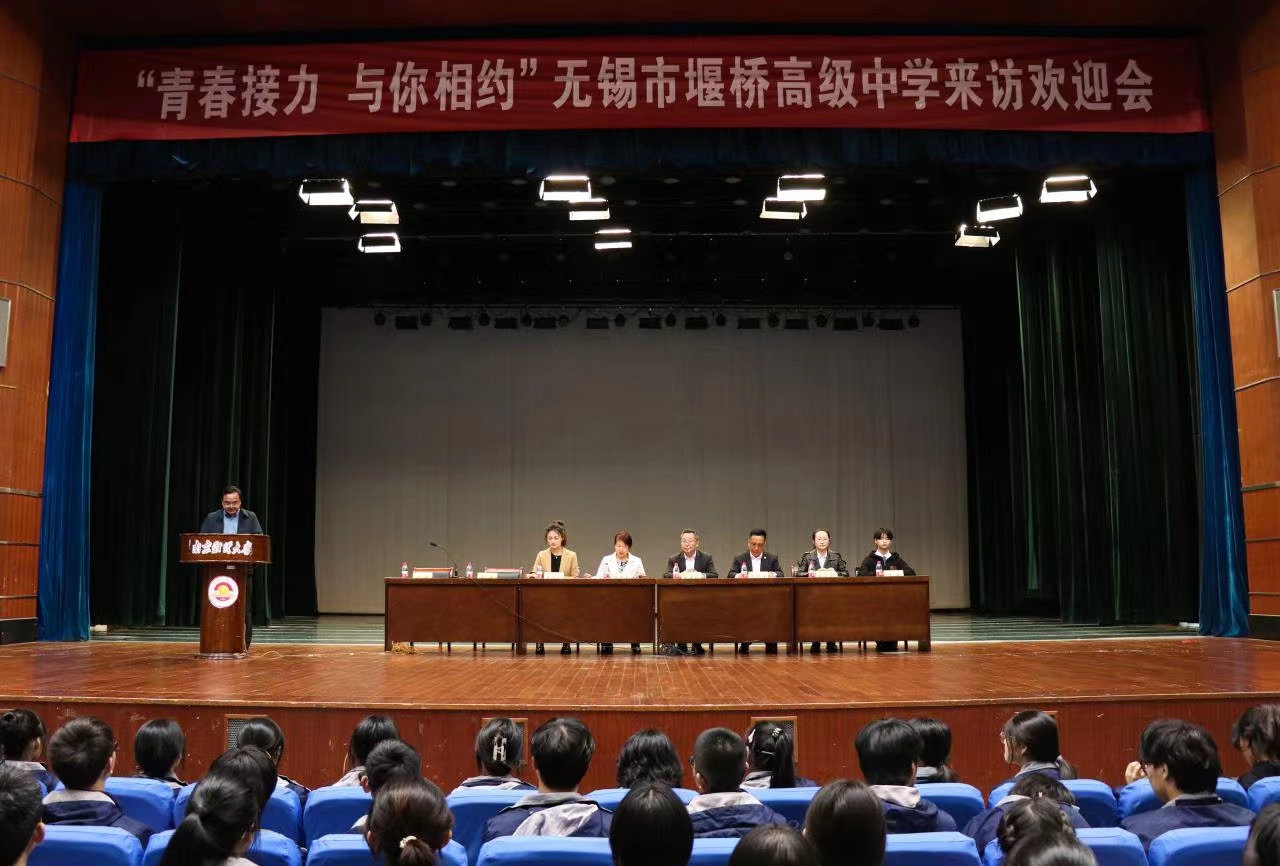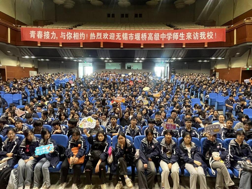 4月26日,无锡市堰桥高级中学高一年级700余名师生走进我校仙林校区开展研学活动,我校在大学生活动中心仙林大礼堂举行“青春接力,与你相约”欢迎会。无锡市堰桥高级中学校长胡建秋、副校长陈登峰,我校党委学生工作部部长、学生处处长韩力争,学生处副处长、招生办公室主任全真真,艺术设计学院党委书记刘浩、党委副书记张荣霞,甘诺职业生涯发展工作室负责人甘诺及以及无锡市堰桥高级中学师生参加欢迎会。欢迎会由刘浩书记主持。