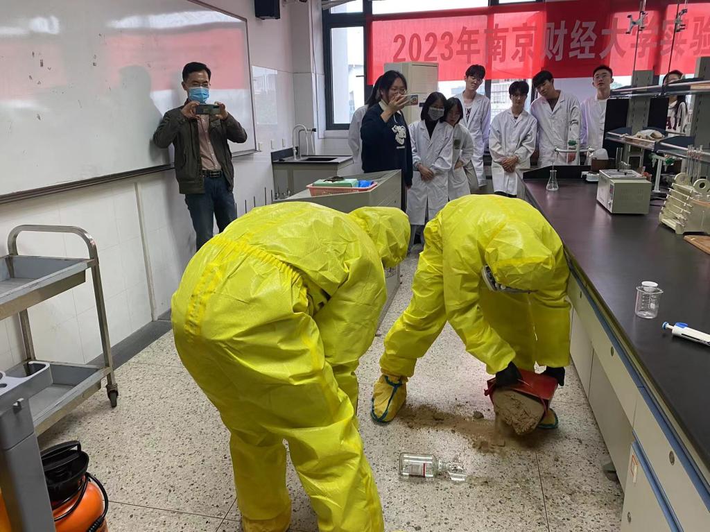 为进一步加强实验室安全管理,提升师生应对突发性实验室危险化学品泄漏的应急处置能力、实验室安全防护及应急事故的处置能力,5月24日,我校在仙林校区工科楼开展安全培训暨安全演练活动。此次演练由教务处、科研处主办,食品科学与工程学院承办,保卫处协助,各单位负责人、主管人员代表、实验室安全管理人员、研究生导师及学生代表参加演练。
