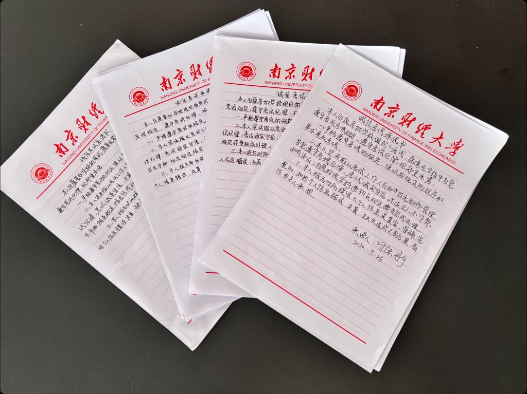 各学院统筹部署、明确责任、妥善安排、创新举措、广泛宣传,保证诚信教育入脑入心入行。通过召开考试动员会,引导学生合理复习、充分准备,传授复习迎考的技巧方法,形成积极正向的应考心态,塑造和谐互助的学习环境。通过开展主题班会,辅导员老师、班干部带领全体学生深入学习《南京财经大学考场纪律与违纪处分规定》《南京财经大学学生学籍管理条例》等规章制度,详细了解其中关于考试作弊等相关规定,并通过生动案例告诫学生警钟长鸣、心存敬畏。党委学生工作部发布《致全体学生的诚信考试倡议书》,倡议各学院组织学生签订诚信考试承诺书,坚定与不良风气作斗争的信心和勇气。通过官微、官网和橱窗进行广泛宣传,如“以诚待考,以信作答”微信推送、“诚信如金”橱窗宣传标语,以沉浸式的氛围营造激励学生将内心的道德准则转化为外在的高尚行动。
