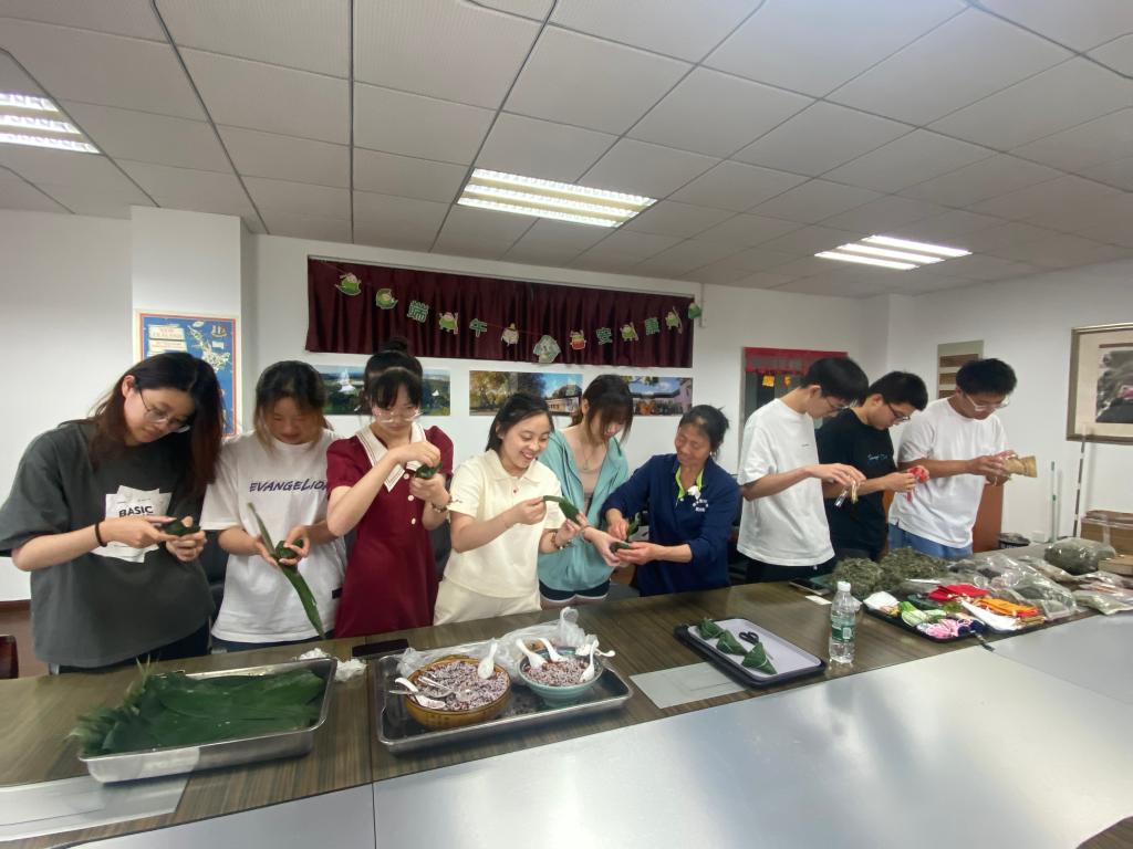 国际教育学院党工委、国际教育学院组织外国留学生开展了“粽情端午”包粽子活动,体验民风民俗,感受传统民俗魅力。南京师范大学附属实验学校高中师生代表应邀一同参加活动。国际教育学院党工委书记、院长王娟介绍了端午节的节日意义以及吃粽子习俗的由来。王娟书记与食堂阿姨讲解了包粽子的要领并作示范。在食堂阿姨手把手教学下,外国留学生们掌握了包粽子的技巧。