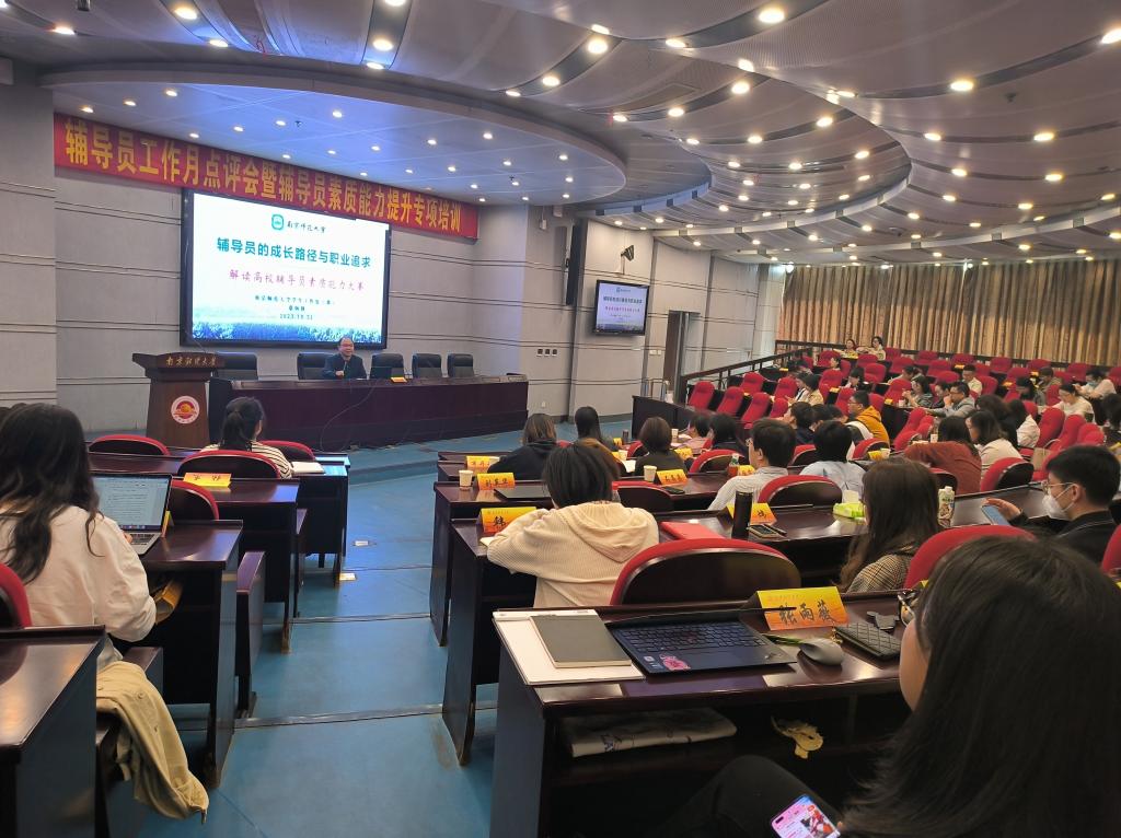 10月31日上午,我校在仙林校区行政楼二楼报告厅举办辅导员素质能力大赛专题培训暨辅导员月点评会。南京师范大学学生处副处长、党委学生工作部副部长蔡炳锋应邀担任主讲嘉宾。党委学生工作部部长、学生处处长韩力争,心理健康教育中心主任、学生处副处长赵亮,党委研究生工作部、学生处相关负责人,各学院党委(党总支)副书记及全体辅导员参加活动。