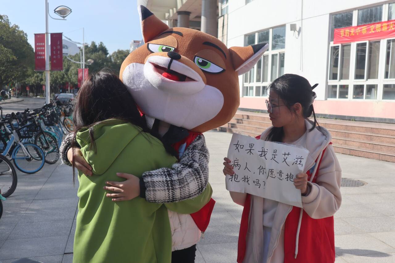 防艾宣传入校园,预防知识记心间。“蓝经灵”志愿者通过电子显示屏、街边展示板向同学们介绍预防艾滋病的方法和措施;通过防艾问答小互动等方式于校园各处宣传防艾知识,力求达到“人人知、人人记”的效果;通过“暖心抱抱”帮助同学们消除恐惧与误解,许多同学纷纷主动上前拥抱身着玩偶服扮演艾滋病患者的志愿者,为寒冷的冬日带来温暖。