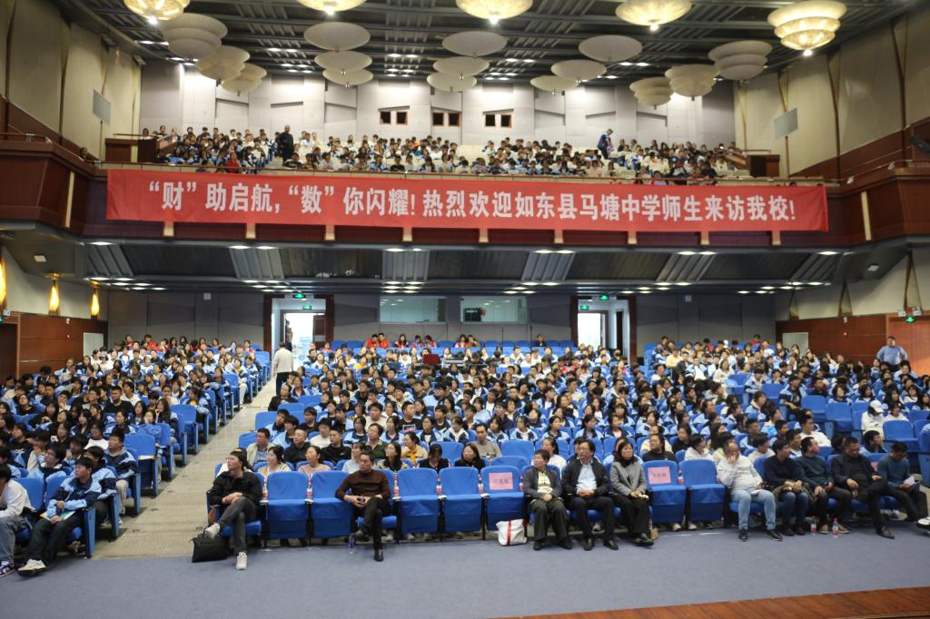 随后,师生们齐聚仙林校区大礼堂。应用数学学院院长方国昌致辞。他向到访的师生致以热烈欢迎,对马塘中学持续为我校输送优质生源表示由衷感谢。他希望同学们在此次活动中近距离感受南财文化,喜爱南财环境,继而也能成为南财的宣传员、推广员。同时,他勉励同学们砥砺前行,在高考中取得理想成绩,在丰收的金秋九月再次相聚南财。学生处副处长全真真从历史沿革、师资力量、特色专业等角度,详细介绍了我校教学环境、学科建设及发展成就。应用数学学院副院长孙成峰介绍了学院概况、专业特色、培养方案、课程体系和就业方向,让师生们对学院的学术氛围和专业特色有了更加全面的认识。心理健康教育中心高剑婷老师作了主题为“让爱回家——家人相处,沟通有道”的心理讲座,她借助冥想练习,分享了萨提亚沟通模式和冰山理论,和大家探讨有效沟通方法,期待同学们以更好的心态为理想大学全力以赴。