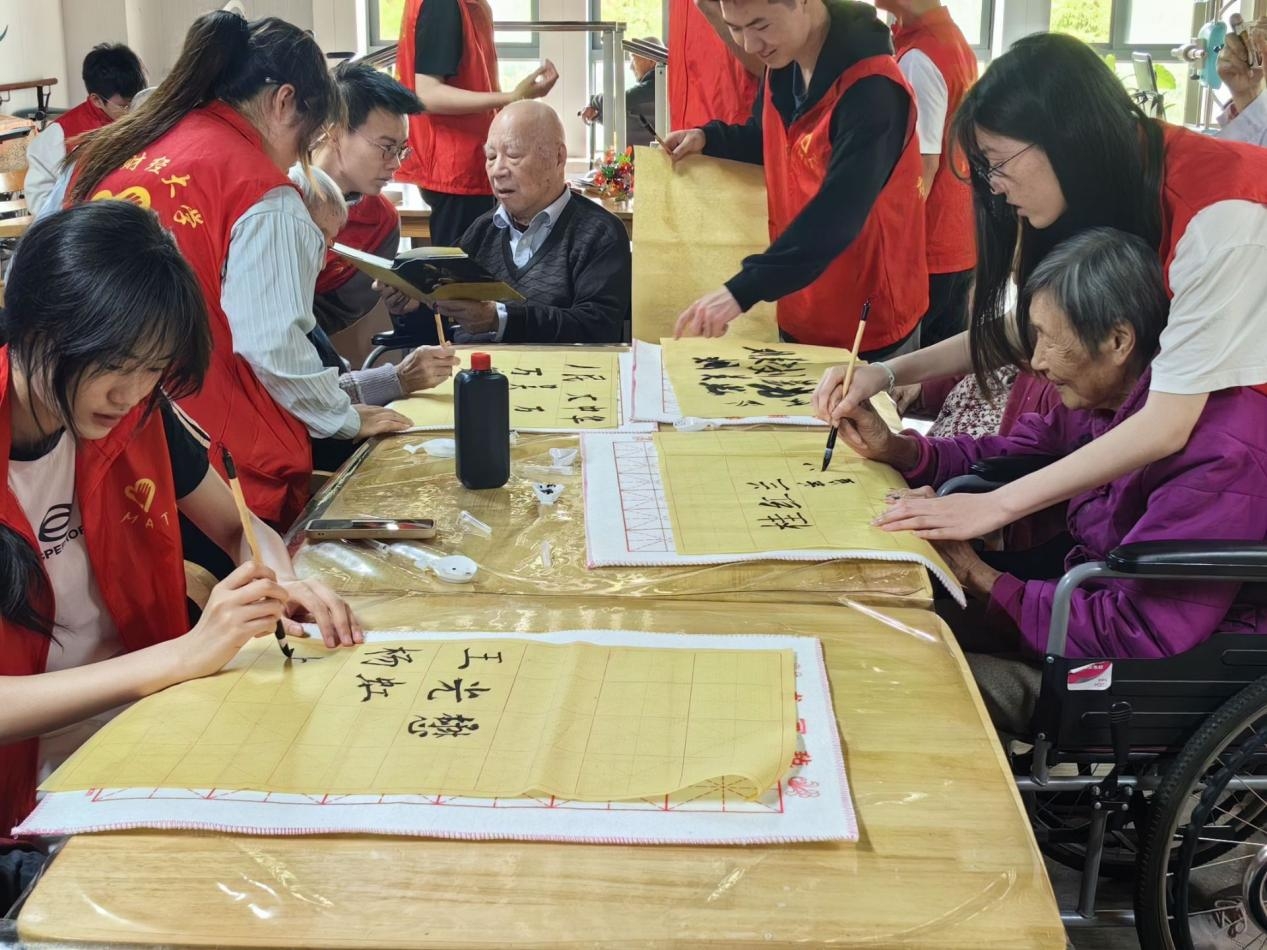 应用数学学院志愿者前往南京市爱馨护理院,为老人读书,声情并茂的读书声让阅读不再局限于文字世界,变得生动立体,让阅读在交流中升温;共同进行书法创作,在切磋交流中感受着毛笔的起落顿挫,体会运墨收笔、体会一撇一捺间蕴含的人生哲理。