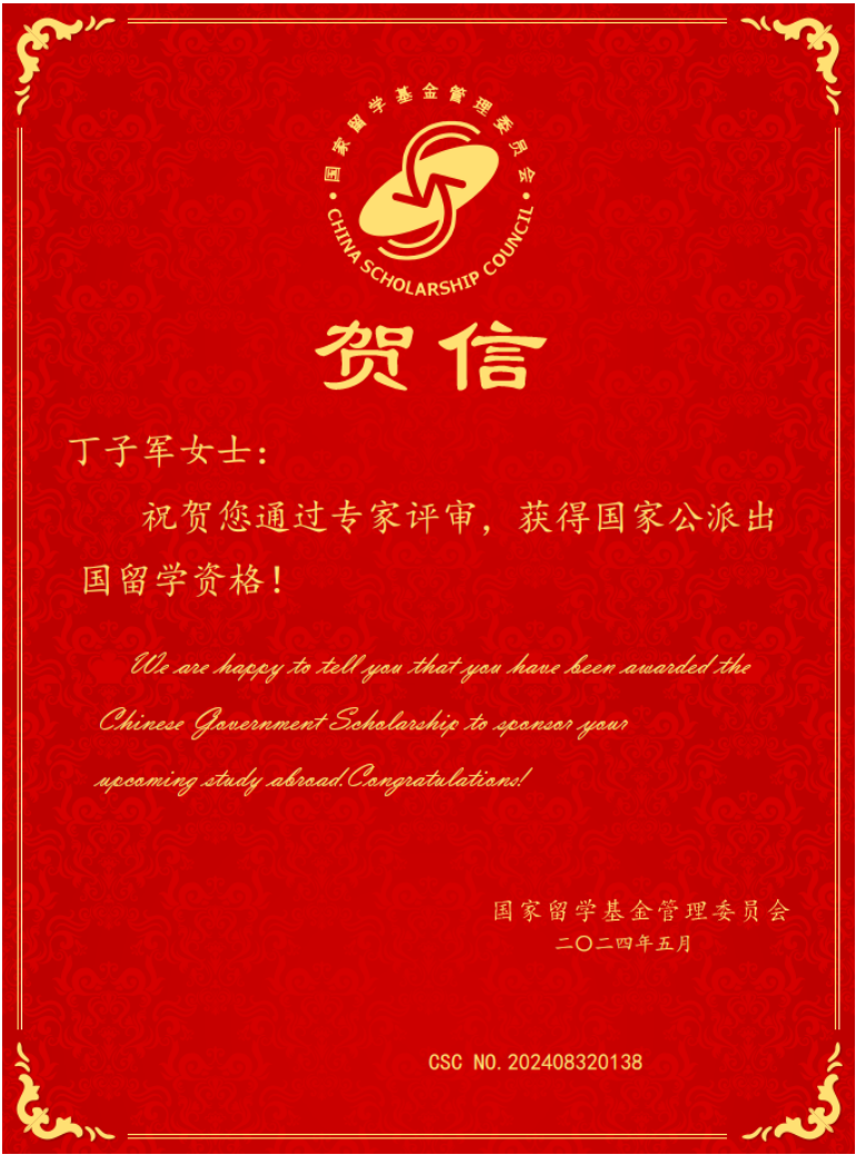 近日,国家留学基金管理委员会2024年国家建设高水平大学公派研究生项目个人渠道的评审结果出炉,我校公共管理学院2021级工商管理学(房地产管理)专业硕士研究生丁子军获得国家公派出国留学资格,将于今年9月赴比利时根特大学攻读博士学位,根特大学免收学费,国家留学基金连续提供48个月的留学生活费、一次往返国际旅费及签证申请费。