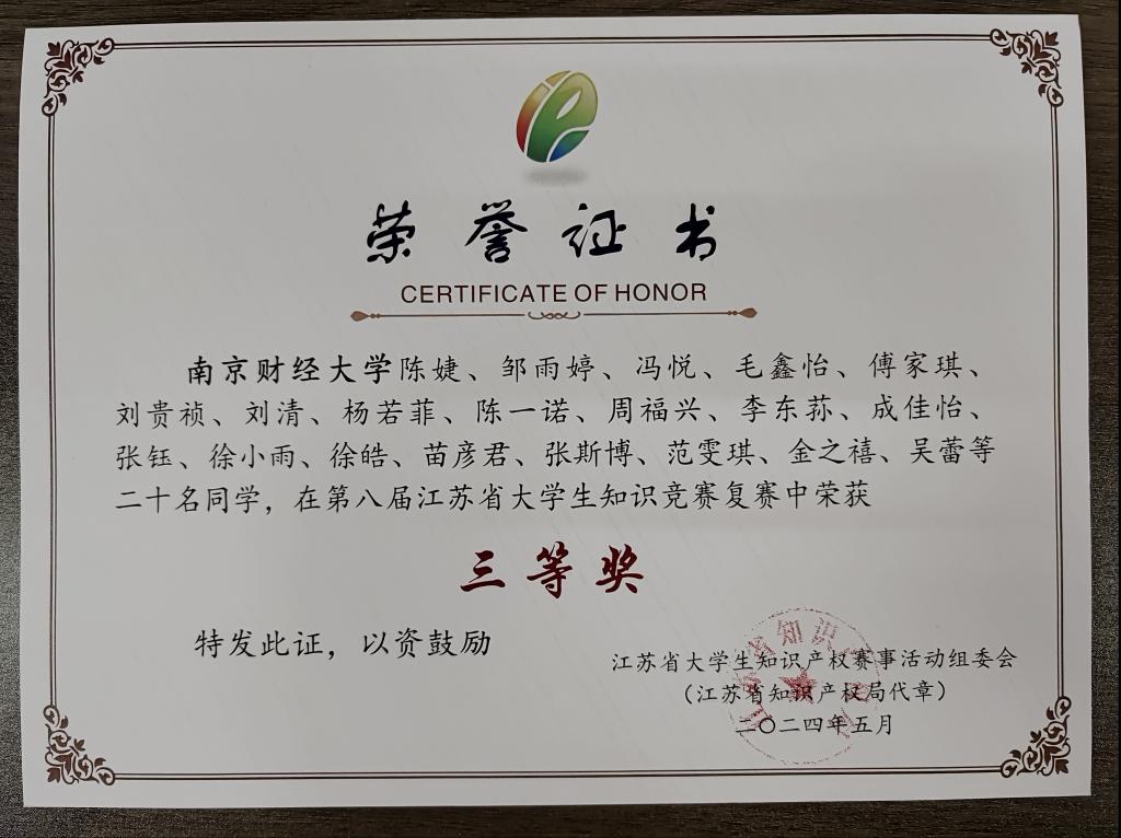 近日,第八届江苏省大学生知识产权知识竞赛在南京市电视台举办。法学院组织师生积极参加,经过激烈角逐,最终斩获了复赛团队三等奖、优秀院校组织奖、优秀指导老师奖等多项荣誉。