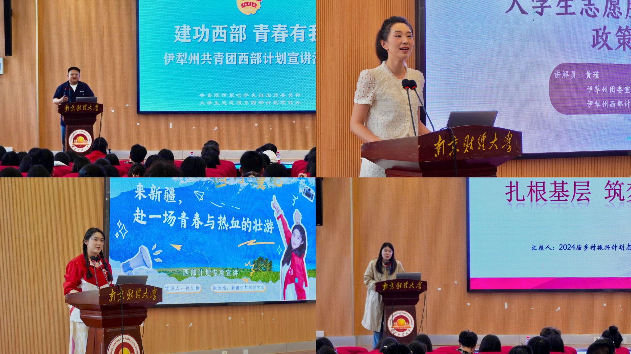 4月22日下午,我校2025年“西部计划”“乡村振兴计划”宣讲会在仙林校区大学生活动中心三楼报告厅举办。伊犁州团委副书记罗跃峰、伊犁州团委宣传部副部长黄瑾、团江苏省委社会联络部(志工部)三级主任科员黄磊、校团委副书记陈涛以及我校2025届毕业生及非毕业年级学生参加活动。校团委宣传与科创实践科副科长徐曼主持宣讲会。
