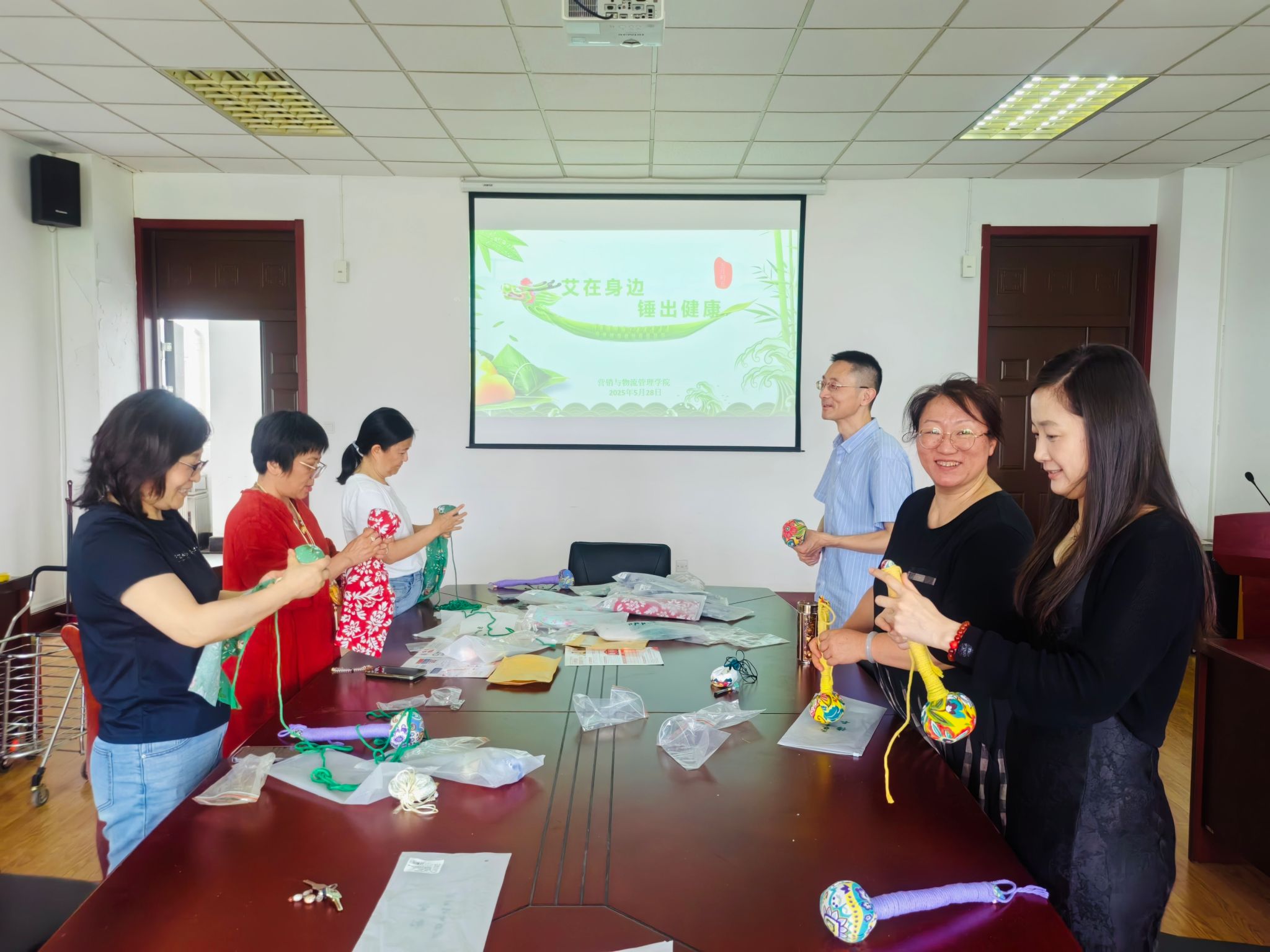 营销与物流管理学院开展艾草锤手工制作活动。老师们齐聚一堂,用五彩斑斓的花粗布将艾草包包进布内,并捏成一个紧实的圆形,再将木柄与艾草包固定,最后用棉绳进行缠绕。伴随着欢声笑语和阵阵艾草香,一个个色彩鲜明、风格各异的艾草锤便制作完成了。