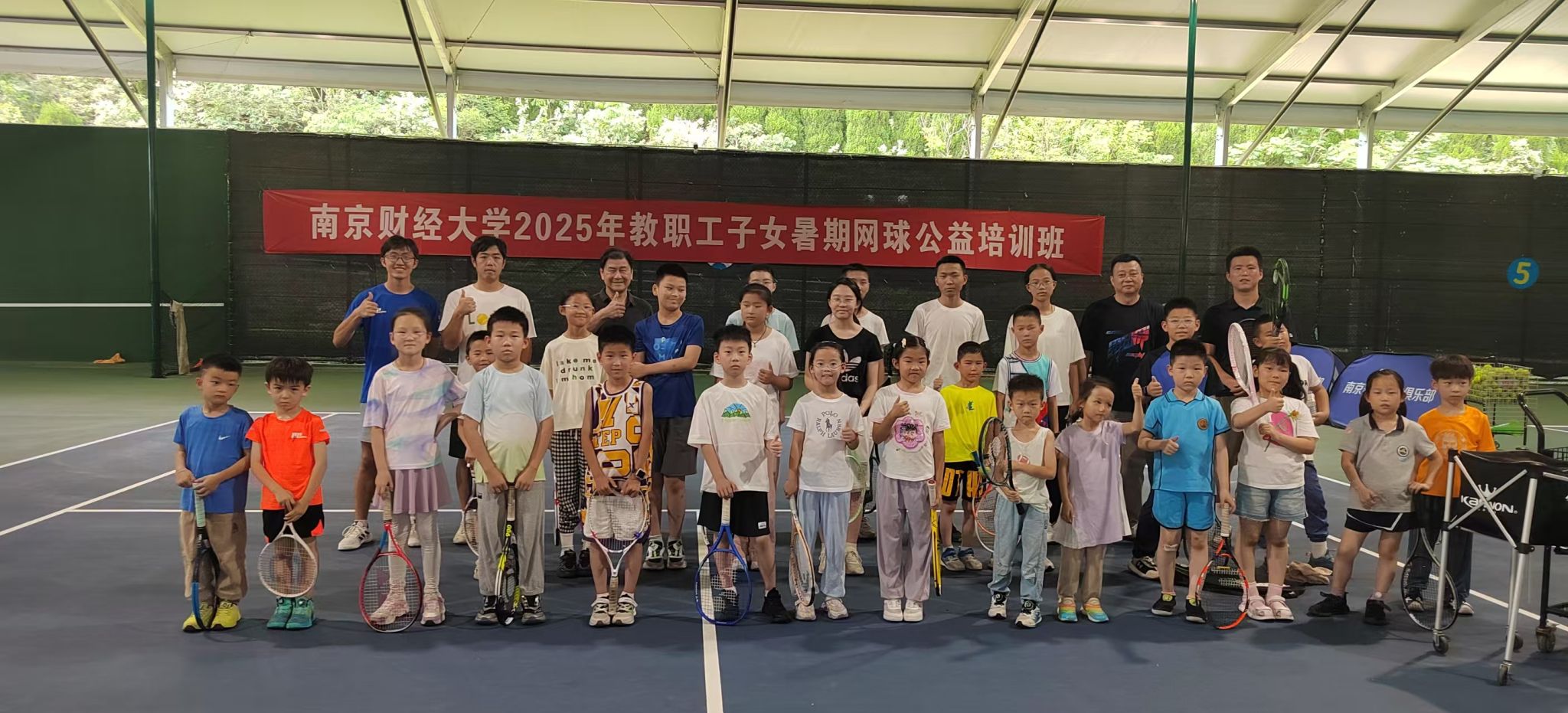 7月2日下午,我校教职工子女暑期网球公益培训班开班仪式在仙林校区中苑风雨网球场举行。近五十名小学员、赛点网球俱乐部的教练们、校工会主席孙丹兵、体育部主任严永军参加开班仪式。