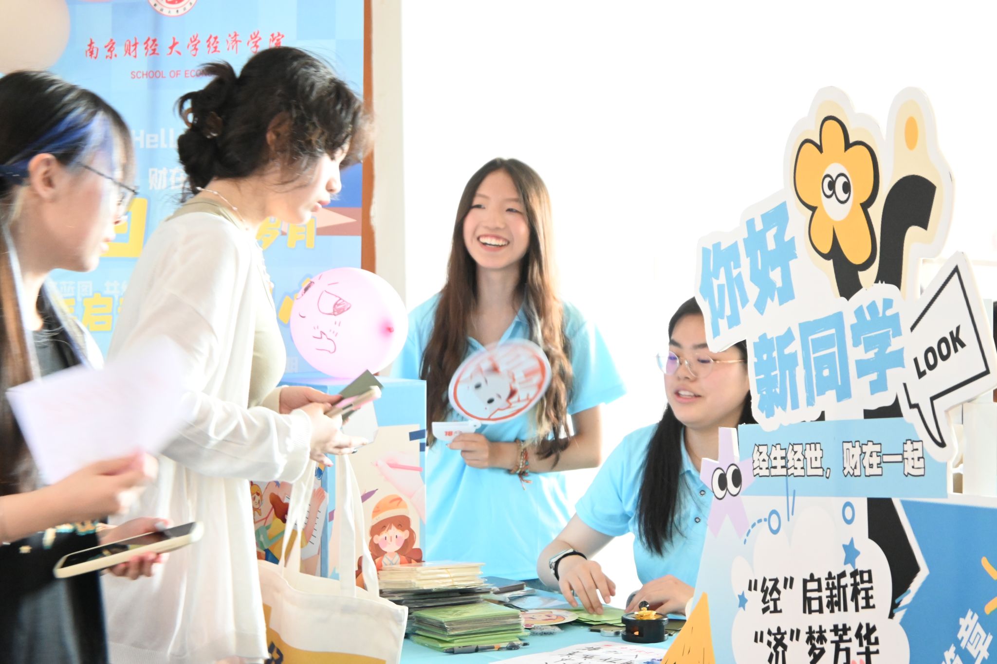 工商管理学院在报到互动区设置电子盲盒,新生扫码即可开启,若抽中诗意文字,便可兑换校园文创礼品。在“人·成大观”拼图共创区,每位新生随机领取一枚拼图碎片,碎片上绘有南财独特文化符号,大家齐心协力完成巨幅拼图。