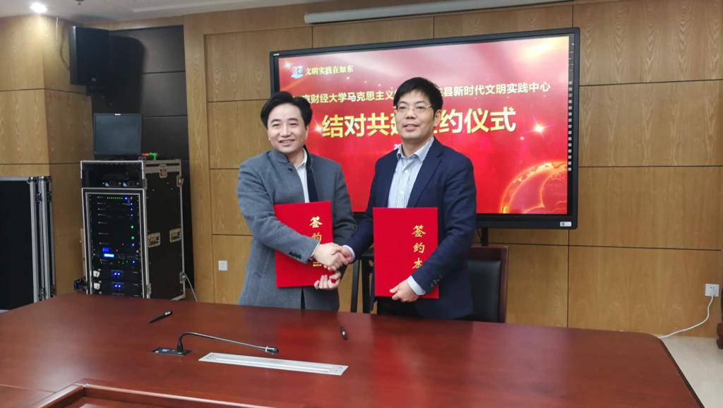1月31日下午,南京财经大学马克思主义学院与如东县新时代文明实践中心举行结对共建签约仪式。南京财经大学马克思主义学院院长梅景辉教授与如东县委副书记陈雷代表双方进行签约。