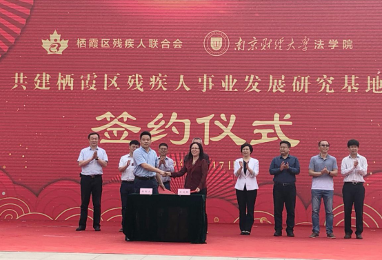 活动现场,我校法学院副院长胡宜奎与栖霞区残联理事长黄伟共同签订了栖霞区残疾人事业发展研究基地合作意向书。我校法学院副院长何旺翔作为政协委员,也共同见证了研究基地的共建。共建研究基地,旨在促进双方在残疾人事业发展理论与实践研究的合作交流与资源共享,为残疾人事业发展探索总结经验,为新时代残疾人事业发展提供制度设计,推动残疾人事业创新发展。同时,我校法学院社工系主任许芸与栖霞团区委、栖霞区残联、栖霞区文化和旅游局的代表共同启动了栖霞区高校公益助残项目。