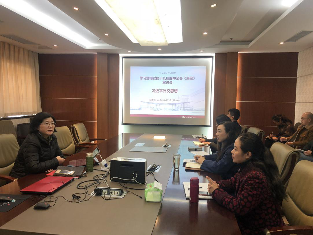 11月28日下午,校党委常委、副校长邱伟芬在仙林校区行政楼1409会议室为国际教育学院党工委、国际合作与交流处党支部上了一堂题为“坚持和完善独立自主的和平外交政策,推动构建人类命运共同体——学习贯彻党的十九届四中全会精神”的党课。国际教育学院党工委、国际合作与交流处党支部全体党员参加了党课学习。