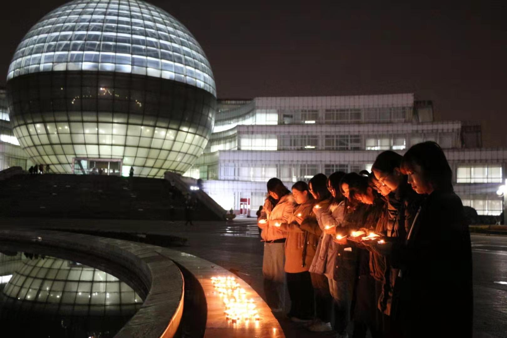 12月12日,艺术设计学院学生在艺术楼广场举办“烛光祭”。活动中,同学们用蜡烛在广场中央摆放出“12·13”“和平”的字样以及“和平鸽”的形状,并手捧蜡烛围成一圈,低头凝视着手中微微烛光,缅怀在82年前那场人类浩劫中不幸罹难的同胞,共同祈愿世界远离战争,永远和平。与此同时,学院各团支部开展了形式多样的信仰公开课,共同铭记历史,缅怀遇难同胞。