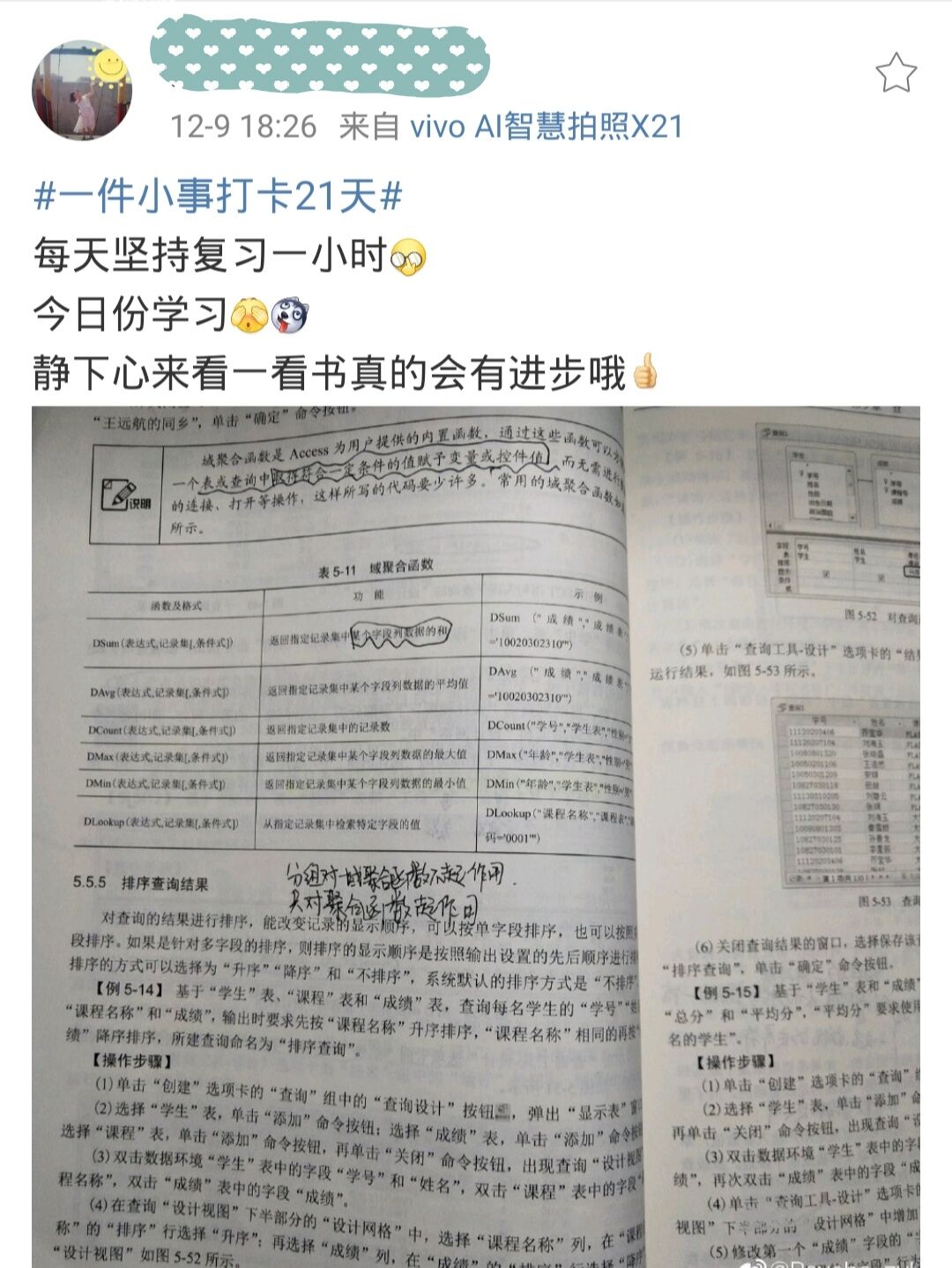 12月1日起,为鼓励大学生们养成良好的习惯,管理科学与工程学院举办了“21天习惯养成”活动。本次活动以一件小事打卡21天为主题,参与方式不限,活动形式不限,包括跑步、练字、减肥等,参与者每天拍照并配上生动形象的文案分享自己的感受,累计微博打卡21天,则视为完成挑战。