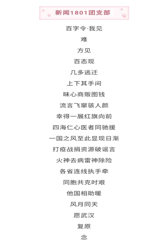 传递必胜信念。“我们自信且坚定:没有不可逾越的冬天,没有不会降临的春天!”校团委号召大家勠力同心,克服困难,助力战胜疫情。经统1701、法学1801、数学1901等团支部用诗歌表达了共度疫情难关的信念,“城垣紧闭,挡不住万里驰援,众志成城,我们把难关共度”。会计1901团支部录制无声祝福视频、管理1901等团支部自制全体团员家乡话祝福视频、国贸1902等团支部用苍劲有力的书法和手抄报,表达了团结一致战胜疫情的必胜信心。